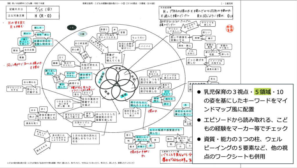 日々の記録は、その日のトピックを1つ(1人のこども、または1つの遊び)に絞り、数枚の写真と簡潔な文章でまとめます。 それと同時に、「乳児保育の3つの視点」や「5領域」「10の姿」をマインドマップ風に配置したワークシートを用意。エピソードから読み取れるこどもの経験をマーカーでチェックしていくことで、専門的な視点からのこども理解をできるようにしています。