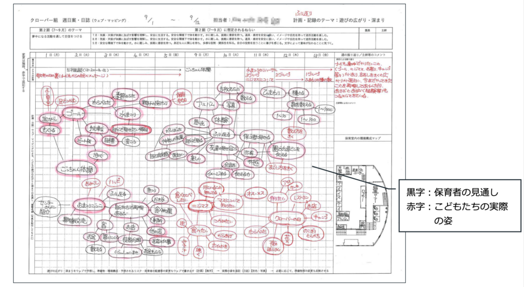 同園では、こどもの遊びの広がりを予想する「ウェブマッピング(保育ウェブ)」形式で週日案を作成。 黒字で「大人の見通し(仮説:〜かもね)や願い(〜なったらいいな)」を書き出し、実際のこどもたちの姿や遊びの展開を赤字でどんどん追記していきます。